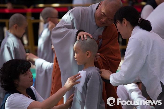 (서울=포커스뉴스) 2일 오전 서울 종로구 조계사 대웅전 앞마당에서 열린 동자승 단기출가 보리수 새싹학교 삭발, 수계식에서 동자승들이 삭발을 하고 있다.