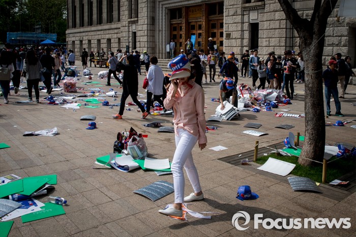 (서울=포커스뉴스) 근로자의날을 맞은 1일 오후 서울광장에서 열린 한국노총 5.1 전국노동자대회를 마친 참가자들이 종로로 행진을 이어가고 있다.