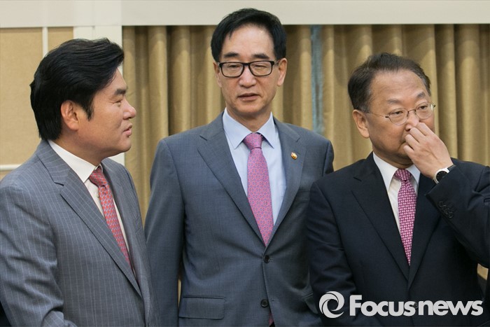 (서울=포커스뉴스) 27일 오전 서울 여의도 국회 귀빈식당에서 열린 청년 · 여성 일자리대책 당정협의 참석자들이 대화하고 있다. 왼쪽부터 원유철 새누리당 대표최고위원 권한대행, 이준식 사회부총리, 유일호 경제부총리.