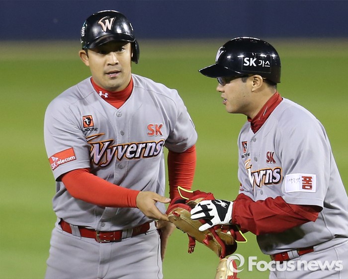 (서울=포커스뉴스) 27일 서울 잠실구장에서 열린 2016 프로야구 SK-두산 경기 6회초 2사 1루에서 SK 정의윤이 좌익수 왼쪽으로 빠지는 1타점 2루타를 치고 박진만 코치의 축하를 받고 있다.