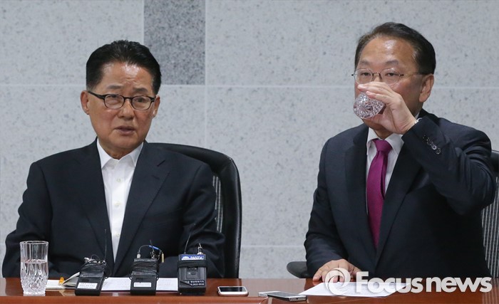 (서울=포커스뉴스) 박지원(왼쪽) 국민의당 원내대표가 29일 오전 서울 여의도 국회 의원회관에서 경제활성화법안 등 처리 요청을 위해 방문한 유일호 경제부총리 겸 기획재정부 장관과 면담을 하고 있다.