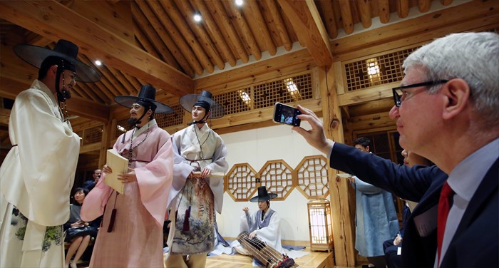 (서울=포커스뉴스) 문화체육관광부 해외문화홍보원(원장 김갑수)이 주한 외국인을 대상으로 한국문화를 소개하는 문화공감 콘서트 '헬로, 미스터 케이!(Hello, Mr. K!)’가 27일 성북구가구박물관에서 열렸다. 이날 콘서트에 참석한 주한 외국대사가조선시대 선비 생활상을 조명한 한복 패션쇼를 휴대폰으로 촬영하고 있다. <사진제공=문화체육관광부>