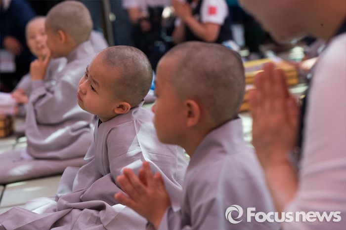 (서울=포커스뉴스) 2일 오전 서울 종로구 조계사 대웅전 앞마당에서 열린 동자승 단기출가 보리수 새싹학교 삭발, 수계식에서 동자승들이 삭발한 뒤 합장을 하고 있다.