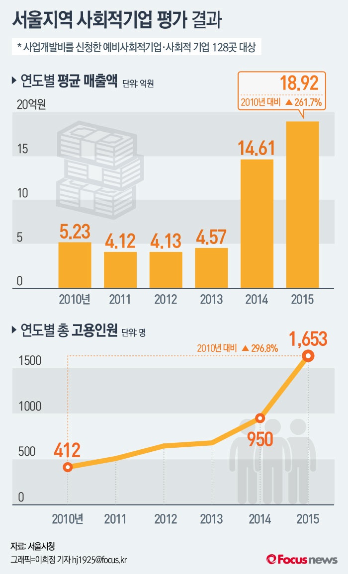 (서울=포커스뉴스) 서울시가 1일 발표한 사업개발비를 신청한 예비사회적기업·사회적기업 128곳을 평가한 결과 2015년 매출액은 2010년 대비 261.7%증가한 18억9,236만원으로 나타났다. 고용인원은 1,635명으로 2010년 대비 296.8% 증가했다.
