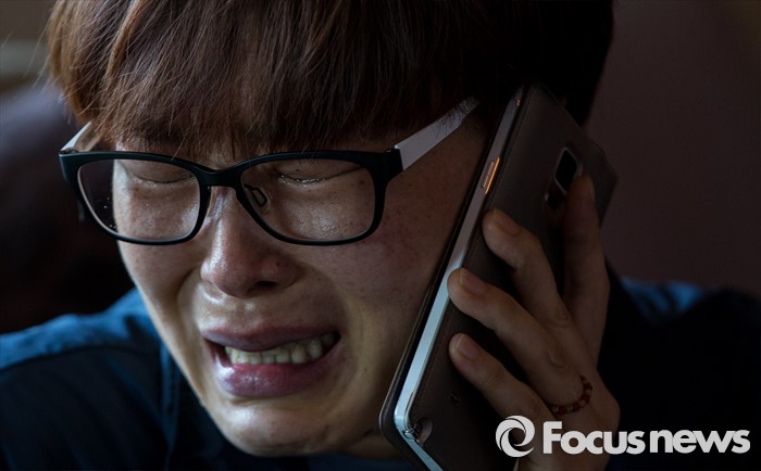 (서울=포커스뉴스) 2일 오전 서울 영등포구 콘래드호텔에서 열린 '옥시레킷벤키저(현 RB코리아) 가습기 살균제 파동' 관련 기자회견장 앞에서 피해자 가족인 곽윤희 씨가 통화 도중 오열하고 있다.