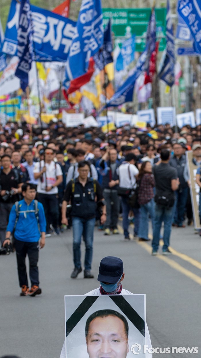 (서울=포커스뉴스) 근로자의날을 맞은 1일 오후 서울 종로구 대학로에서 민주노총 주최로 열린 '2016 세계노동절대회'를 마친 참가자들이 종로로 행진을 이어가고 있다.