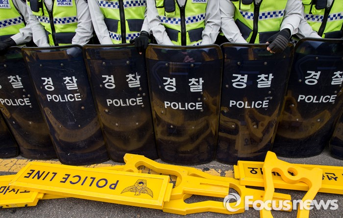 (서울=포커스뉴스) 근로자의날을 맞은 1일 오후 서울 종로구 대학로에서 민주노총 주최로 열린 '2016 세계노동절대회'에서 경찰과 420장애인차별철폐공동투쟁단원들의 충돌로 통제선이 무너져 있다.