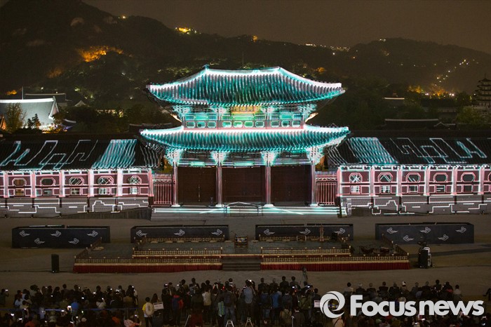 (서울=포커스뉴스) 29일 저녁 서울 경복궁 흥례문 광장에서 열린 제 2회 궁중문화축전 개막제에서 경복궁의 역사를 빛으로 담아낸 '미디어 파사드' 공연이 시선을 사로잡고 있다. '오늘, 궁을 만나다'를 주제로 열리는 2016년 궁중문화축전은 다채로운 프로그램들과 함께 5월 8일까지 열린다.