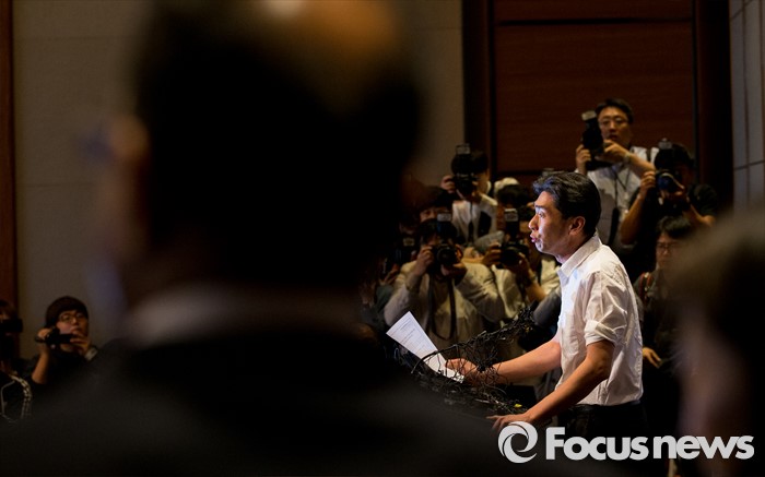(서울=포커스뉴스) 2일 오전 서울 영등포구 콘래드호텔에서 열린 '옥시레킷벤키저(현 RB코리아) 가습기 살균제 파동' 관련 기자회견에서 가습기 살균기 피해자 연대의 최승운 씨가 항의발언을 하고 있다.