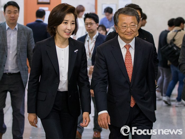 (서울=포커스뉴스) 새누리당 차기 원내대표 경선 후보등록 마감 예정일인 1일 오전 서울 여의도 국회 정론관에서 차기 원내대표 후보인 나경원 의원과 정책위의장 후보 김재경 의원이 출마 기자회견을 마친 후 발걸음을 옮기고 있다.