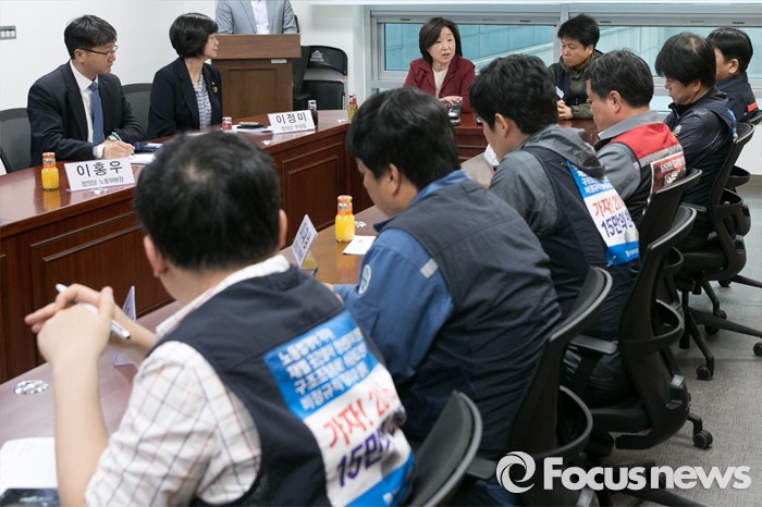 (서울=포커스뉴스) 심상정(맨 뒷줄 왼쪽) 정의당 대표가 27일 오후 서울 여의도 국회 의원회관에서 조선업종 구조조정 긴급현안 간담회에 참석해, 모두발언하는 동안, 조선업계 노조 대표들이 경청하고 있다.
