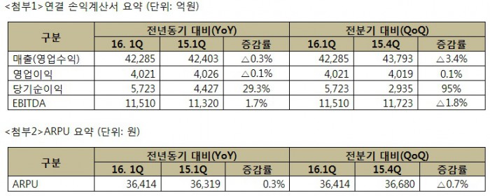 SK텔레콤은 연결 재무제표 기준으로 2016년 1분기 영업이익이 전년 대비 0.1% 감소한 영업이익 4021억원을 기록했다고 28일 발표했다. 매출은 가입비 폐지 및 선택약정할인 가입자 증가 등의 영향으로 전년 동기 대비 0.3% 감소한 4조2285억원을 기록했다. 순이익은 SK하이닉스 지분법 이익 감소에도 불구하고, 자회사인 SK플래닛의 로엔 매각에 따른 손익 반영으로 전년 동기 대비 29.3% 증가한 5723억원을 기록했다.