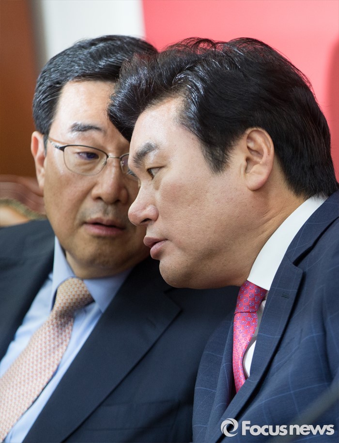 | △ 귀엣말하는 원유철·김정훈 |