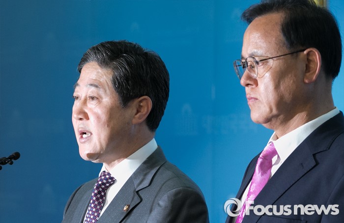 (서울=포커스뉴스) 유기준(왼쪽) 새누리당 의원이 28일 오후 서울 여의도 국회 정론관에서 정책위의장 러닝메이트 후보인 이명수 의원과 원내대표 출마 기자회견을 하고 있다.