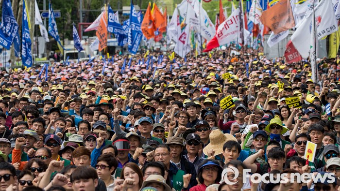 (서울=포커스뉴스) 근로자의날을 맞은 1일 오후 서울 종로구 대학로에서 민주노총 주최로 열린 '2016 세계노동절대회' 참가자들이 구호를 외치고 있다.