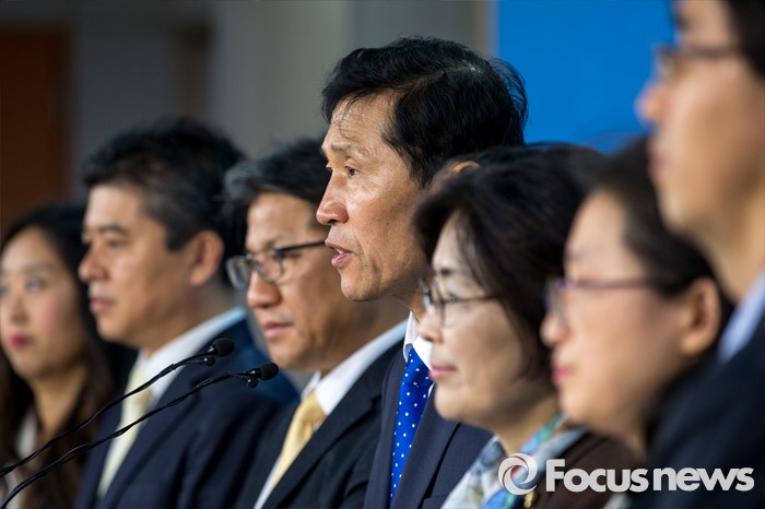 (서울=포커스뉴스) 이학영(오른쪽 네번째) 더불어민주당 의원이 2일 오전 서울 여의도 국회에서 테러방지법 시행 관련 기자회견을 하고 있다.