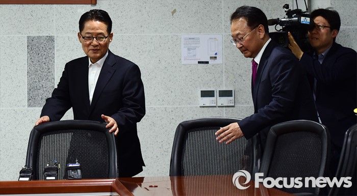 (서울=포커스뉴스) 박지원(왼쪽) 국민의당 원내대표가 29일 오전 서울 여의도 국회 의원회관에서 경제활성화법안 등 처리 요청을 위해 방문한 유일호 경제부총리 겸 기획재정부 장관과 면담을 위해 자리에 앉고 있다.