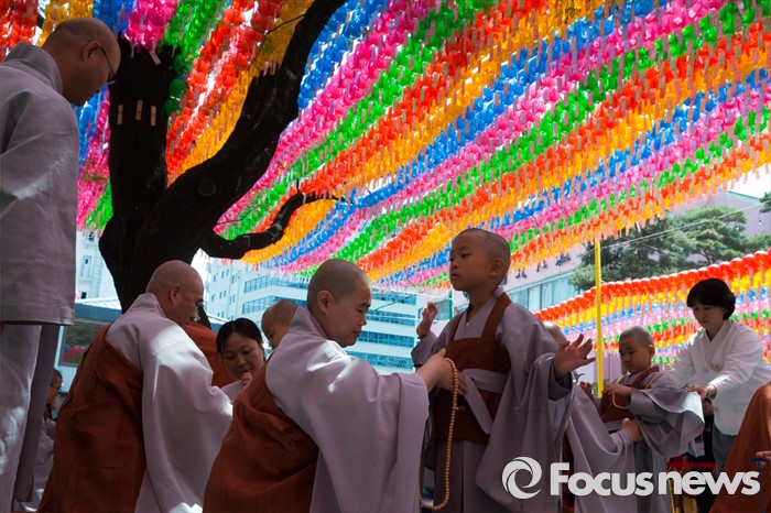 (서울=포커스뉴스) 2일 오전 서울 종로구 조계사 대웅전 앞마당에서 열린 동자승 단기출가 보리수 새싹학교 삭발, 수계식에서 동자승들이 삭발을 마친 후 스님의 도움을 받고 있다.