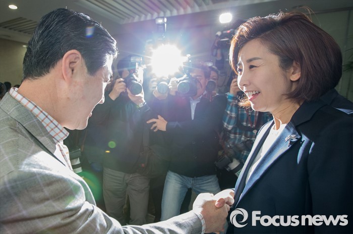 (서울=포커스뉴스) 새누리당 차기 원내대표 경선 후보등록 마감 예정일인 1일 오전 서울 여의도 국회 정론관 앞에서 차기 원내대표 후보군으로 거론되는 유기준(왼쪽), 나경원 의원이 악수하고 있다.