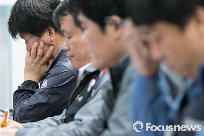 (서울=포커스뉴스) 27일 오후 서울 여의도 국회 의원회관에서 조선업종 구조조정 긴급현안 간담회에 참석한 조선업계 노조 대표들이 무거운 표정을 하고 있다.