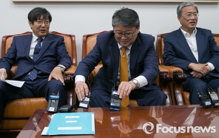 (서울=포커스뉴스) 조원진(가운데) 새누리당 원내수석부대표가 27일 오후 서울 여의도 국회에서 진행된 19대 마지막 임시국회 의사일정 및 쟁점법안 등 논의를 위한 회동에 참석해 유성엽(오른쪽) 국민의당 원내수석부대표의 첫 모두발언이 끝나자 다음 발언 순서인 이춘석 더불어민주당 원내수석부대표의 자리로 방송용 마이크를 옮기고 있다.