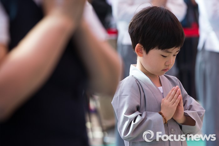 (서울=포커스뉴스) 2일 오전 서울 종로구 조계사 대웅전 앞마당에서 열린 동자승 단기출가 보리수 새싹학교 삭발, 수계식에서 동자승이 합장을 하고 있다.
