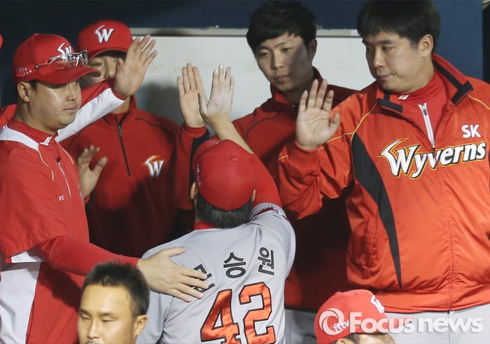 (서울=포커스뉴스) 28일 서울 잠실구장에서 열린 2016 프로야구 SK-두산 경기에서 5회까지 무실점으로 두산 타선을 잘 봉쇄한 SK 투수 문승원을 덕아웃의 동료들이 하이파이브하며 환영하고 있다.