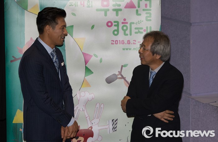 (서울=포커스뉴스) 26일 오전 서울 동작구 아트나인에서 열린 '제4회 무주산골 영화제' 기자간담회에 참석한 배우 오지호(왼쪽)와 유기하 집행위원장이 대화를 나누고 있다.
