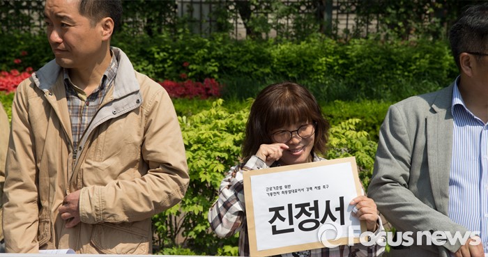 (서울=포커스뉴스) 29일 오전 서울 서초구 서울중앙지검 앞에서 열린 '불법 기업주 강력 처벌 촉구, 유흥희 분회장 항의 노역' 기자회견에 참석한 유흥희 기륭전자 노조분회장이 기자회견 전 미소를 짓고 있다.