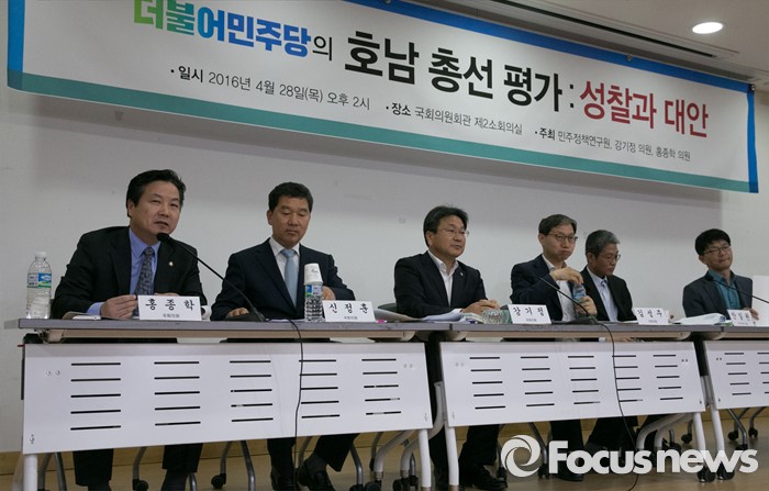 (서울=포커스뉴스) 28일 오후 서울 여의도 국회 의원회관에서 열린 더불어민주당의 호남 총선 평가 성찰과 대안 토론회에 참석한 패널들이 토론을 하고 있다. 왼쪽부터 홍종학, 신정훈, 강기정, 김성주 의원, 안일원 리서치뷰 대표, 오승용 전남대 연구교수.