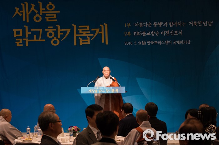 (서울=포커스뉴스) 2일 오후 서울 중구 프레스센터에서 열린 BBS 불교방송 개국 26주년 기념 비전선포식에서 자승 대한불교 조계종 총무원장이 치사하고 있다.