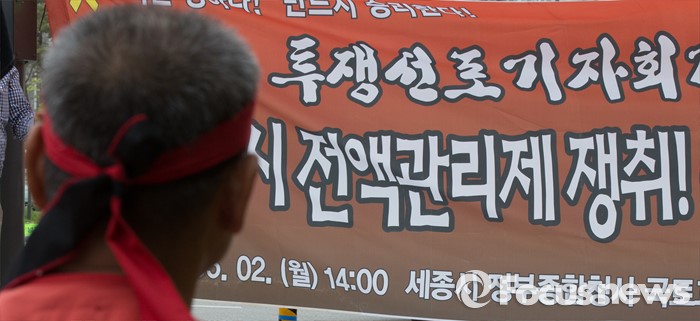 (세종=포커스뉴스) 민주노총 공공운수노조 택시지부 조합원들이 2일 세종 정부세종청사 국토교통부 앞에서 결의대회를 갖고 법인택시 전액관리제 쟁취 및 운송경비 전가행위 금지를 촉구하고 있다.