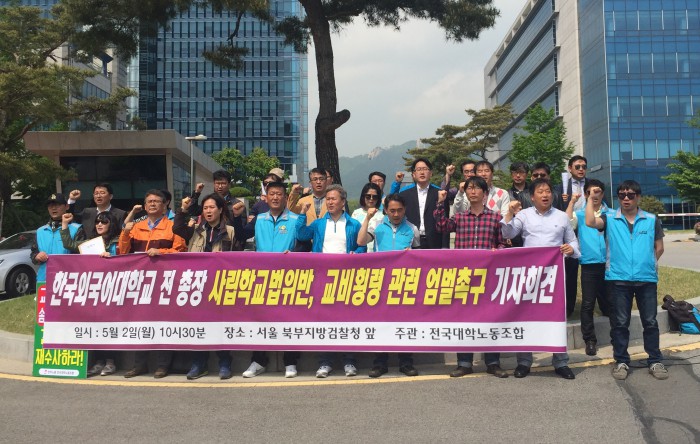 검찰은 고발내용 중 노조원 해고 소송비 12여억원이 잘못 지출됐다고 보고 박 전 총장을 업무상횡령 및 사학법위반 혐의로 지난해 8월 벌금 1000만원에 약식 기소했으나 박 전 총장은 혐의를 인정하지 않고 지난해 9월 정식 재판을 청구했다.(서울=포커스뉴스) 2일 오전 전국대학노동조합은 서울 도봉구 북부지법 앞에서 기자회견을 열고 박철 전 한국외국어대학교 총장의 엄벌을 촉구했다. 김대석 기자