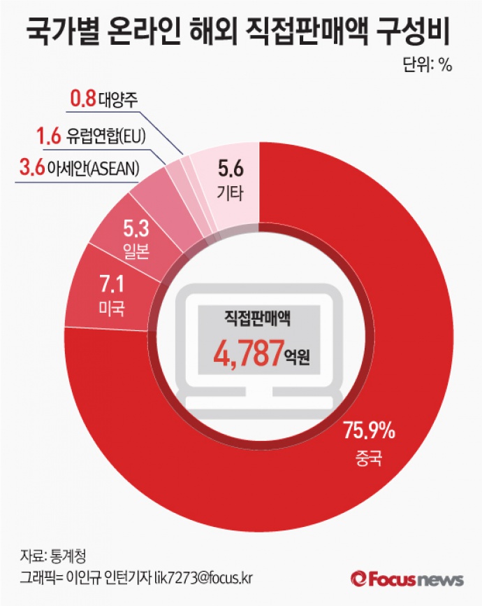 (서울=포커스뉴스) 통계청이 2일 발표한 '1분기 온라인 해외 직접 판매 및 구매 동향'을 보면 국가별로 중국이 3634억원으로 전년 동기 대비 123.6% 증가하면서 전체의 75.9%를 차지했다. 이어 미국 342억원, 일본 254억원, 아세안(ASEAN) 171억원 순이었다.