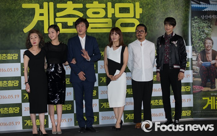 (서울=포커스뉴스) (서울=포커스뉴스) 2일 오후 서울 성동구 왕십리 CGV에서 열린 영화 '계춘할망' 언론시사회에 참석한 배우 윤여정(왼쪽부터) 김고은, 김희원 신은정, 양익준, 최민호가 포토타임을 갖고 있다.