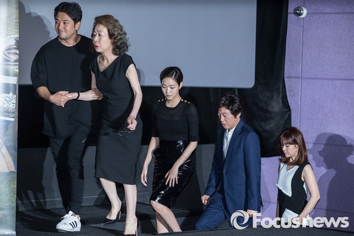(서울=포커스뉴스) 2일 오후 서울 성동구 왕십리 CGV에서 열린 영화 '계춘할망' 언론시사회에 참석한 창감독(왼쪽부터) 배우 윤여정, 김고은, 김희원 신은정이 이동하고 있다.