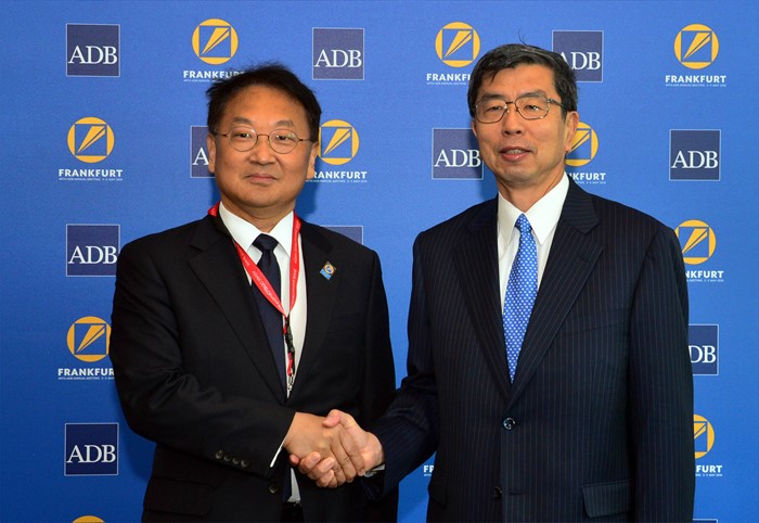(서울=포커스뉴스) 유일호 부총리 겸 기획재정부 장관이 2일(현지시간) 독일 메세 프랑크푸르트에서 나카오 타케히코 ADB(아시아개발은행)총재를 예방하며 악수를 하고 있다. <사진제공=기획재정부>