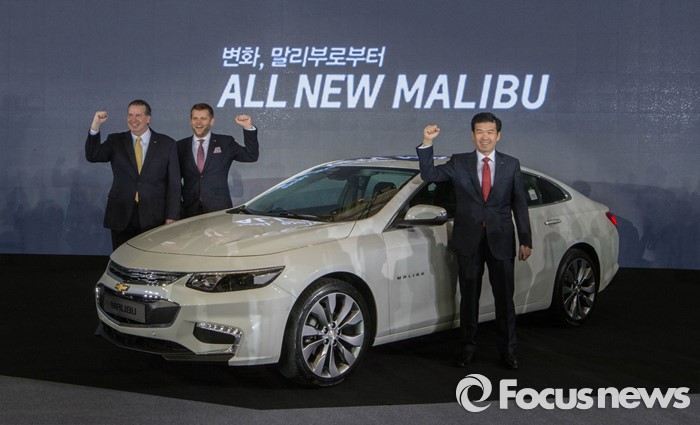 한국GM은 신형 말리부의 판매개시일인 오는 19일을 전후해 전국 전시장에 말리부 시승차량을 배치하고 많은 고객들이 직접 제품의 장점을 경험할 수 있도록 체험 마케팅을 펼칠 계획이다.(서울=포커스뉴스) 27일 오전 서울 구로구 고척스카이돔에서 열린 한국지엠 '올 뉴 말리부' 신차 발표회에서 제임스 김(오른쪽) 한국지엠 사장과 쉐보레 관계자들이 신차 발표를 축하하며 취재진을 향해 포즈를 취하고 있다.2016.04.27 성동훈 기자