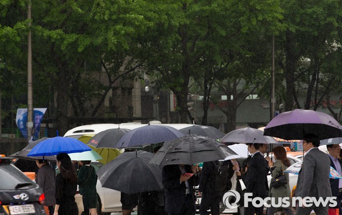 (서울=포커스뉴스) 전국이 흐리고 비가 내리는 3일 오전 서울 광화문네거리에서 시민들이 발걸음을 재촉하고 있다.