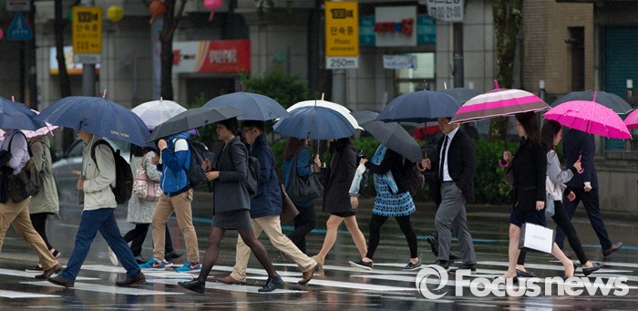 (서울=포커스뉴스) 전국이 흐리고 비가 내리는 3일 오전 서울 광화문네거리에서 시민들이 발걸음을 재촉하고 있다.