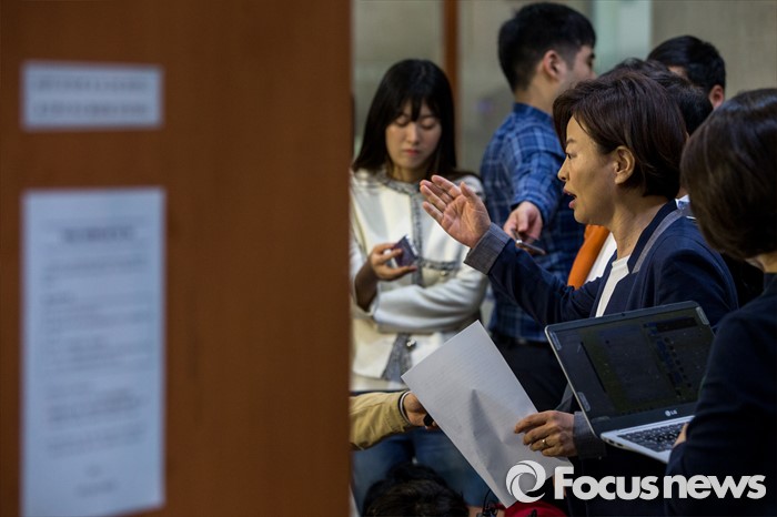 (서울=포커스뉴스) 진선미(오른쪽) 더불어민주당 의원이 3일 오후 서울 여의도 국회에서 어버이연합 등 보수단체 불법자금지원 의혹 관련 기자회견을 마친 뒤 취재진 질문에 답하고 있다.