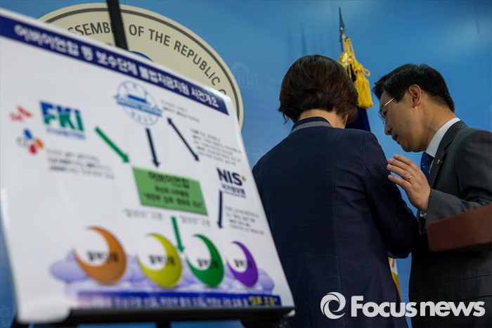 (서울=포커스뉴스) 박범계(오른쪽) 더불어민주당 의원과 진선미 더불어민주당 의원이 3일 오후 서울 여의도 국회에서 어버이연합 등 보수단체 불법자금지원 의혹규명 진상조사 촉구 기자회견을 하던 중 대화를 나누고 있다.
