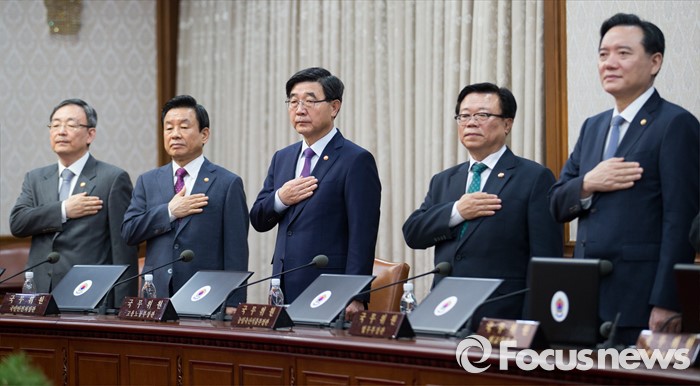 (서울=포커스뉴스) 이기권(가운데) 고용노동부 장관을 비롯한 국무위원들이 3일 오전 서울 종로구 정부서울청사에서 열린 국무회의에 자리해 국민의례를 하고 있다.