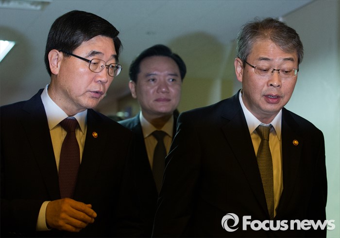 (서울=포커스뉴스) 이기권(왼쪽) 고용노동부장관과 임종룡(오른쪽) 금융위원장이 3일 오전 서울 종로구 정부서울청사에서 열린 국무회의에 참석하며 대화를 나누고 있다.