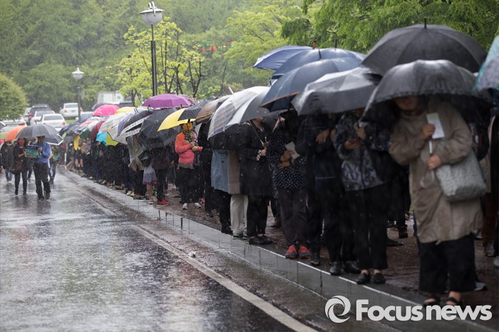 (서울=포커스뉴스) 3일 오전 서울 서초구 국립외교원에서 열린 외교부 배우자회 어려운 이웃돕기 자선바자회에 시민들이 우산을 쓰고 기다리고 있다.