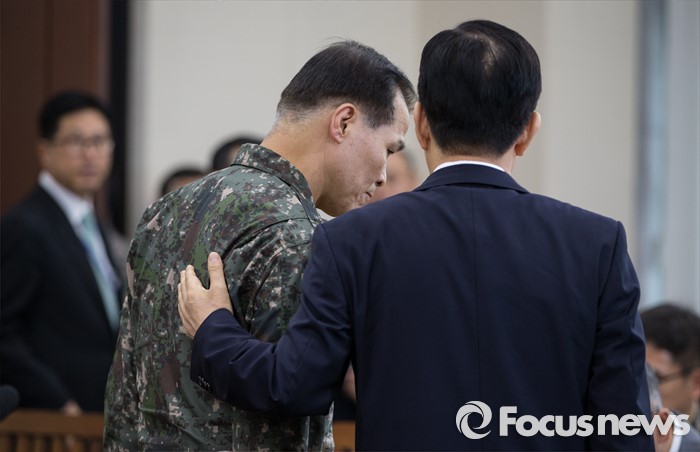 (서울=포커스뉴스) 한민구(오른쪽) 국방부 장관이 3일 오전 서울 여의도 국회에서 열린 국방위원회 전체회의에 참석해 정연봉 국방부 육군 참모차장과 대화하고 있다.