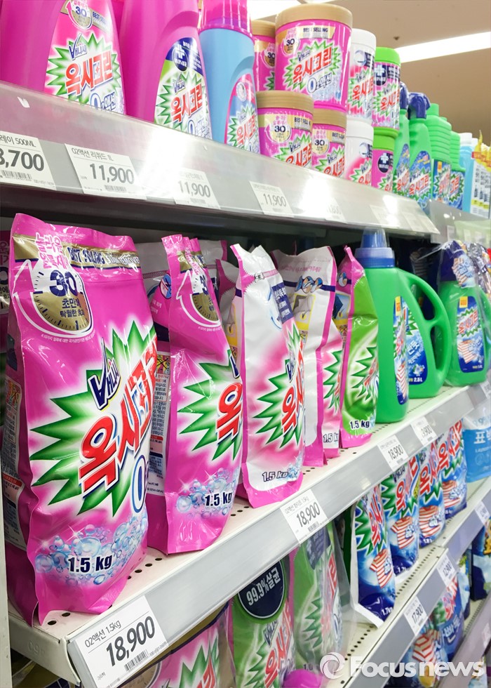 (서울=포커스뉴스) 3일 오전 서울 시내 한 마트에 옥시레킷벤키저 제품들이 진열되어 있다. 지난 2일 아타울라시드 사프달 옥시 대표가 가습기살균제 사건 관련 사과 했지만 피해자 가족과 단체들은 옥시의 사과를 거부하며 1인 시위, 고발장 접수 등 거세게 반발했다.