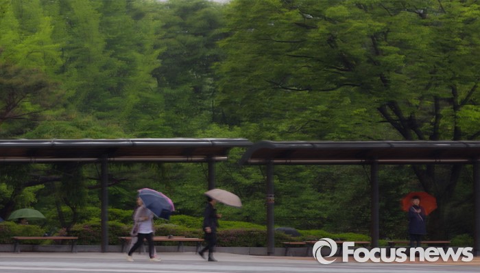 (서울=포커스뉴스) 전국이 흐리고 비가 내리는 3일 오후 서울 송파구 올림픽공원을 찾은 시민들이 발걸음을 재촉하고 있다.