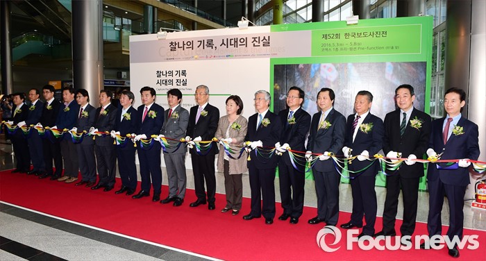 (서울=포커스뉴스) 3일 오전 서울 강남구 코엑스에서 열린 '52회 한국보도사진전 개막식'에 참석한 신성인(왼쪽부터) 한국PR기업협회장, 최운열 더불어민주당 경제상황실장, 류재림 한국영상자료원장, 이중우 한국방송키메라기자협회장, 김정관 한국무역협회 부회장, 정규성 한국기자협회장, 안철수 국민의당 상임공동대표, 원유철 새누리당 대표최고위원 권한대행, 이동희 한국사진기자협회장, 김종인 더불어민주당 비상대책위원회 대표, 심상정 정의당 상임대표, 이병규 한국신문협회장, 김부겸 더불어민주당 당선인, 김동규 건국대학교 언론홍보대학원장, 김문권 한국보도사진가협회장, 키타바타 히데유키 니콘이미징코리아 대표, 강동환 캐논코리아 컨슈머이미징 대표 등 참석 인사들이 테이프 컷팅을 하고 있다. '찰나의 기록, 시대의 진실'을 주제로 진행된 이번 전시는 시대의 진실을 기록한다는 사명감으로 역사의 현장을 묵묵히 지키며 취재한 수백만 컷 중 선정된 150여점과 '현장의 사진기자', '역대 대상 수상작' 등 250여점의 사진이 전시된다.