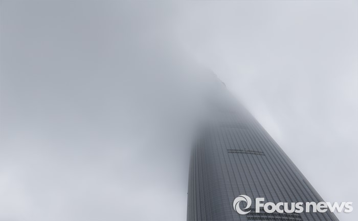 (서울=포커스뉴스) 전국이 흐리고 비가 내리는 3일 오후 서울 송파구 롯데월드타워가 안개에 둘러싸여 있다.